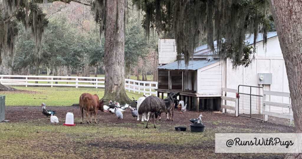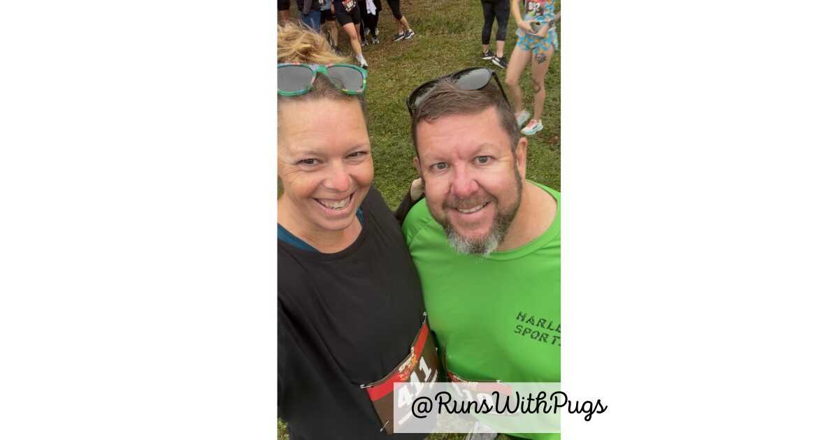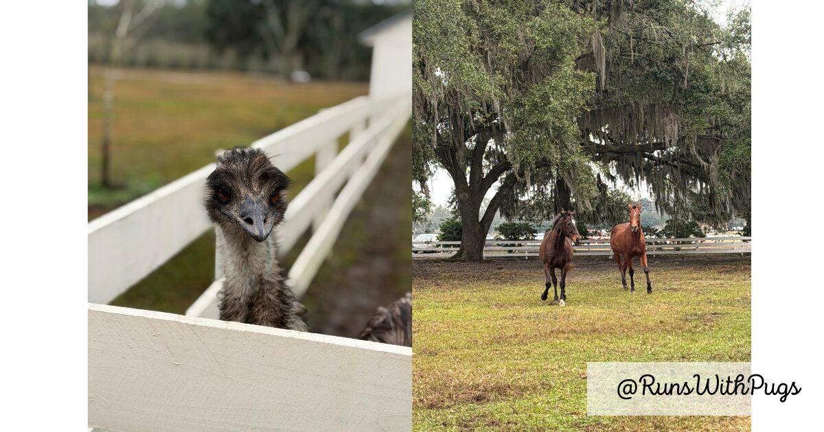 I was out the door at 5:30AM to go visit the boxers again. With a 9:00AM start time, I had plenty of time to do my drop in, pick up a little something to eat, grab Mr PugRunner, and drive the hour to the race venue. It was cold, breezy, and foggy, but we were committed! I knew from last year that the packet pickup was quite a distance from the parking and that there weren’t a lot of bathrooms, so I wanted to have plenty of time to do all the things. Everything went smoothly and we even had time to check out the animals! The horses were FIRED up and were not being at all social.