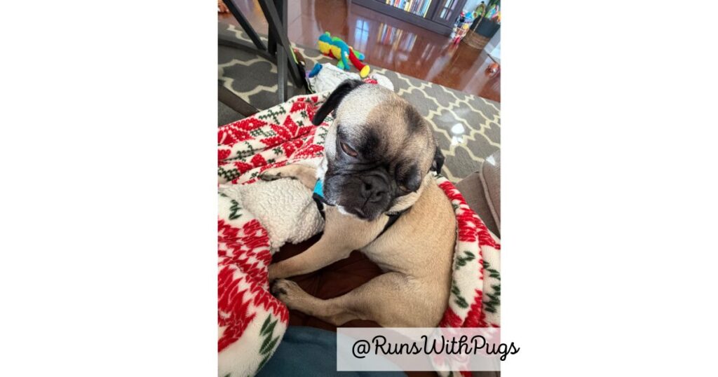 Our first priority was to check on sweet Leonidas, who seemed a little worse. He was hunched over, had a hard time going to the bathroom and was having trouble with all four legs. Ugh. Yes, he was eating and drinking but he was absolutely not himself. Mr PugRunner sat with him while I took a quick run.