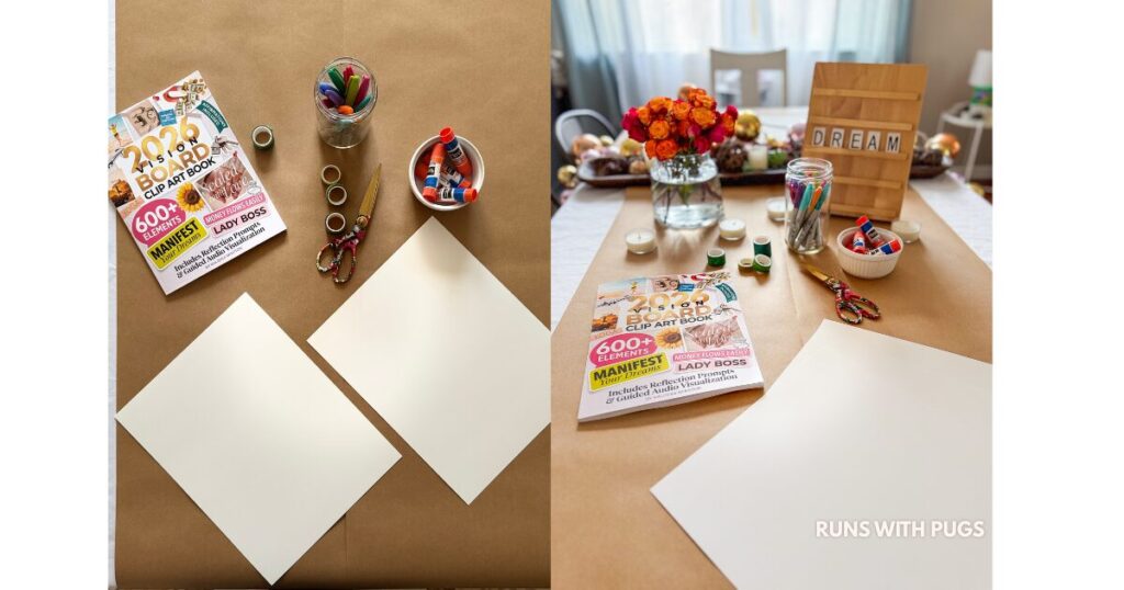 As the host, I like to provide the essentials. I set out poster boards as the base. We have plenty of old school supplies, from which I grab glue sticks, scissors, markers and washi tape. I’ll order a vision board clip art book or two and ask guests to bring magazines to cut up. Everyone is welcome to supplement the stash with different stickers, writing implements, or other craft supplies.