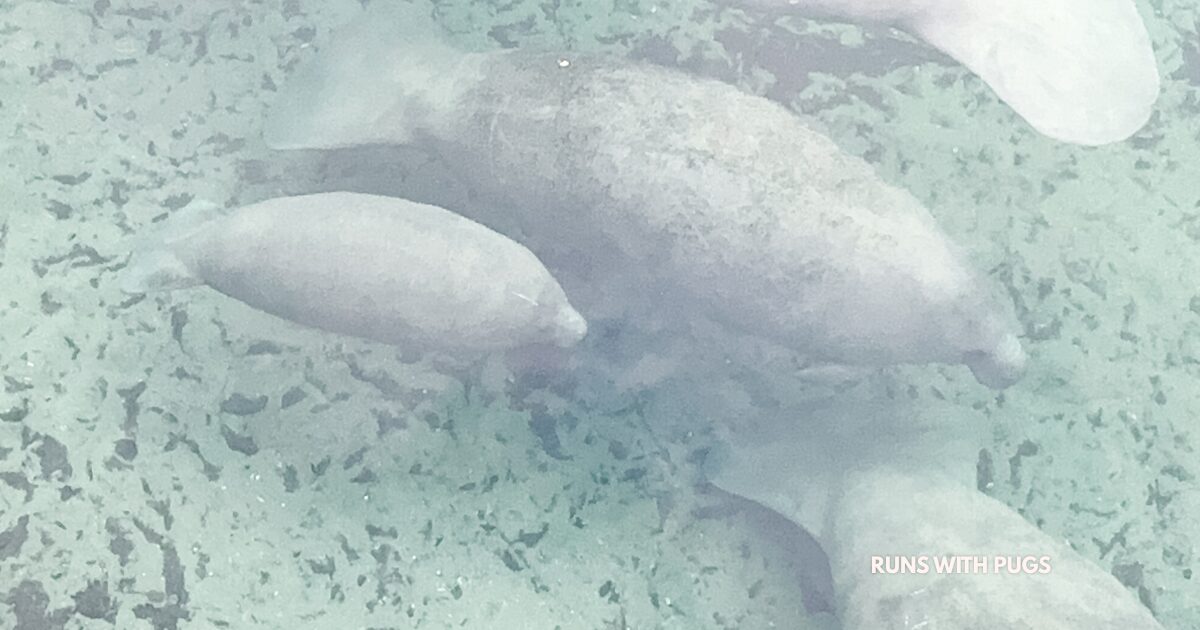 Guide Nat finally maneuvered in and our intrepid party joined her. We had our snorkels and masks, as well as a pool noodle for floating. We pushed off and followed Nat to the main viewing area. At first, as we got oriented, it was really hard to see anything, but then … manatees everywhere!