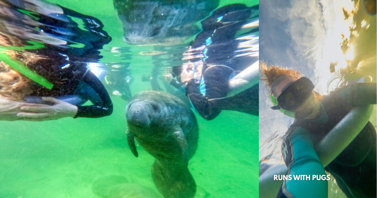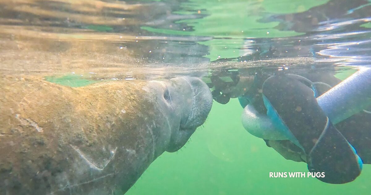 It’s not difficult to encounter manatees in the wild, if you know here to look. For example, they like to linger in canals and near docks, and often surface to snack on vegetation growing on the water. In Blue Spring State Park, observers wander a waterfront boardwalk to admire them from a respectful distance. But then, there are closer encounters. I’ve been approached by manatees while paddle boarding in Salt Run. We’ve seen them surface while out on pontoon boats. Tour companies offer kayaking excursions that take small groups into manatee-rich areas. And even more select groups lead snorkelers into the heart of protected manatee areas. Be still, my animal loving heart.