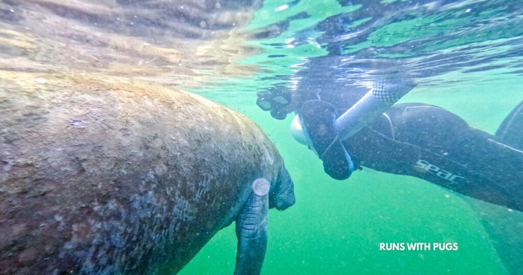 As mentioned, the Florida springs maintain a temperature of 72ºF year round. On a hot, summer day, it feels freezing, but on a 29ºF morning? I’m not going to say it was warm, but with the wetsuit on, I didn’t notice the cold as much. Captain Emerson moved our pontoon into the area on neutral: you could see plenty of little noses and backs rising out of the water. In fact, as soon as we anchored, a curious manatee came up and basically blocked the ladder!