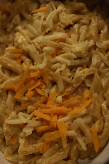 Pour half the pasta mixture into the casserole dish. Sprinkle with half of the remaining cheese, like so.