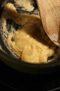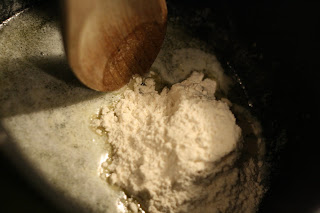Melt 1/2 stick butter in a saucepan. Add about 1/4 cup of flour and combine with a wooden spoon.