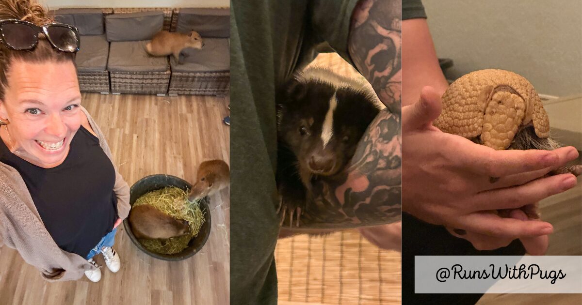 Then Mr PugRunner and I were off for our anniversary outing. We got coffee and donuts, and then headed to the Capybara Cafe, for our Capybara and Friends encounter. After feeding and loving on three capys, we got to see a gorgeous skunk, the coolest armadillo ever, and a red-ruffed lemur!