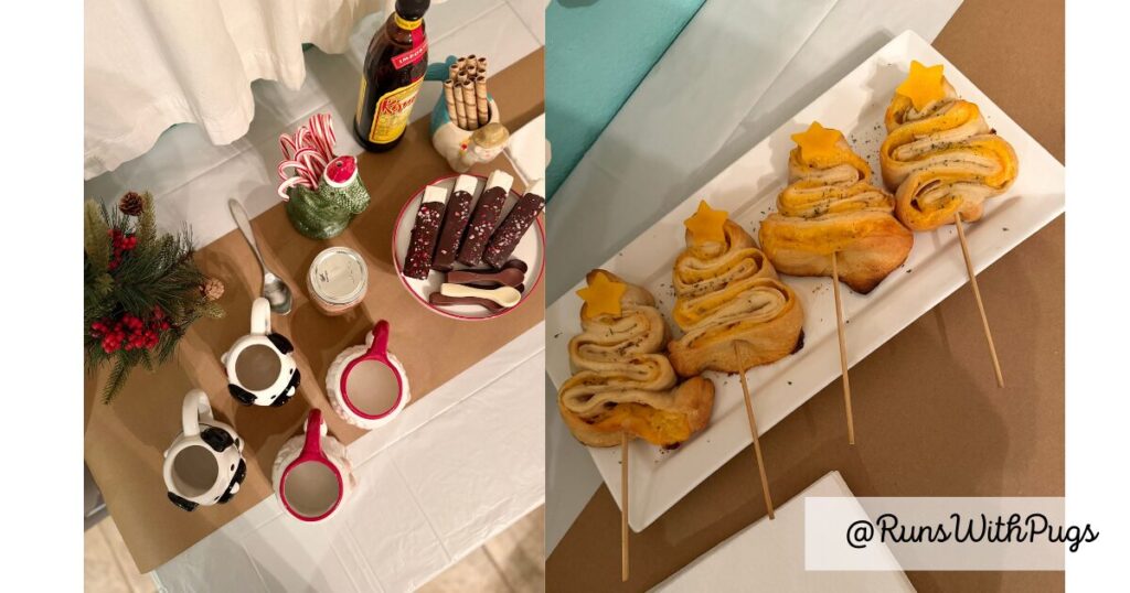 In the evening, we had our friends over for a little cookies and cocoa gathering. It was super simple, with wine, Christmas cookies, veggies with dip, and these cute little puff pastry trees made with turkey and cheese. Easy peasy, and a wonderful night of conversation.