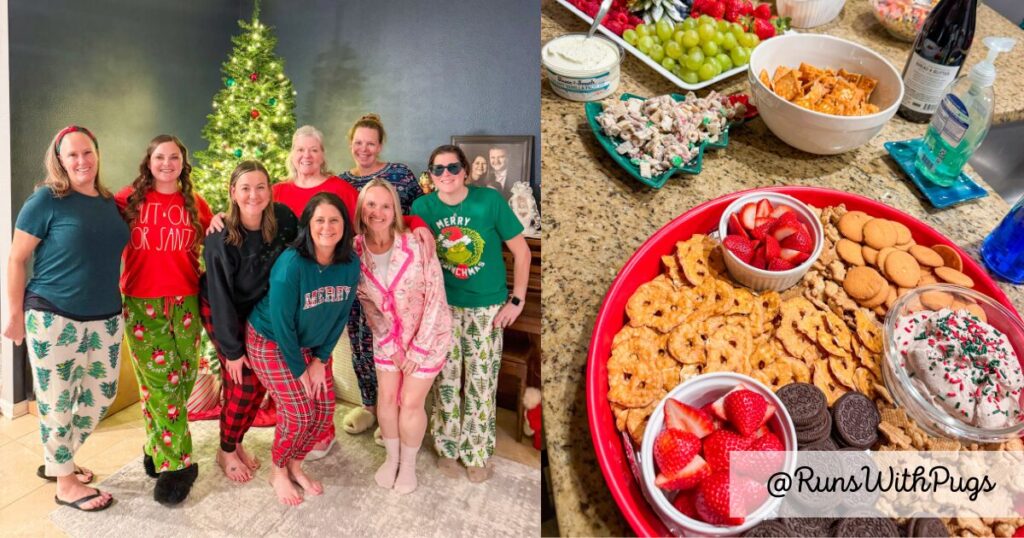 And then we did some stuff around the house for a bit. A had work. Mr PugRunner went out with his friend. And I had a party with some of my PTA/PTSO/booster friends. We did a riff on a “favorite things” party, except the “theme” was useful things or things that reminded us of how we met or were connected. I found these amazing little bullet journals that I added a flair pen to: as volunteers, we were always taking notes, and everyone loves those Flair pens! We wore holiday pajamas, played LeftRightCenter, and had the best time.