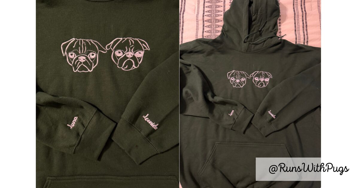 Santa did bring me new running shoes and inserts (yay!), but my best gift was probably this hoodie with the pugs’ faces and names embroidered on it. The artist did an amazing job capturing their facial expressions.