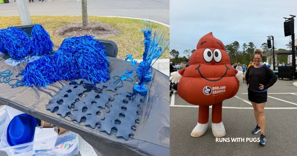 I picked up my big and shirt (they gave everything in a nice, reuseable bag), dropped extras in my car, and then went in to explore. I used the bathroom twice, because of course I did, and I cruised around the vendors and such. There’s always great giveaways and photo opps at this event. I never thought I would pose with an inflatable poop mascot, but here we are.